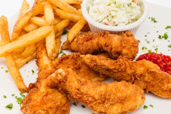Chicken tenders are thin strips of juicy chicken coated in a crispy, deep fried breading and served hot.