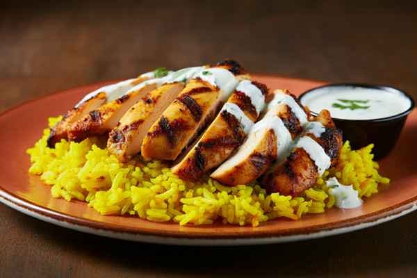Chicken over Rice has marinated and grilled chicken served on top of yellow rice with yogurt sauce.