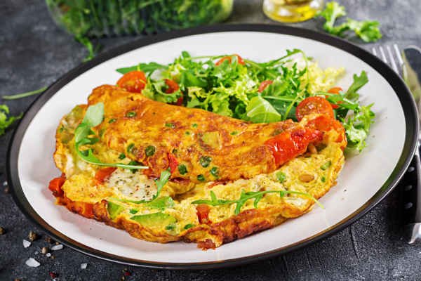 An omelette made with shredded cheddar cheese, onions, chopped peppers and avocado.