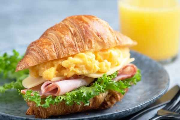 Slices of turkey ham with egg and cheese served on a buttery and flaky croissant.